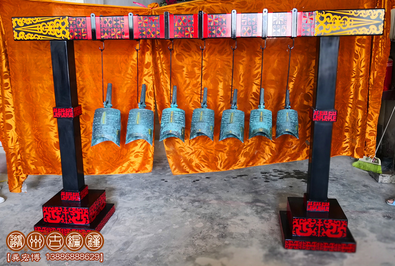 隨州古編鐘公司按客戶要求制作7件仿古編鐘,長2.35米×寬0.45米×高1.5米。編鐘外形按照聞名世界的隨州曾侯乙編鐘仿制,編鐘為青銅鑄造;采用標準音音高A=440Hz調(diào)音1——7,要求聲音清脆悅耳,有延續(xù)音,無啞音編鐘,編鐘大梁采用優(yōu)質(zhì)板材制作,表面按設(shè)計噴漆,彩繪花紋,配套演奏木錘1把,包裝木箱。
