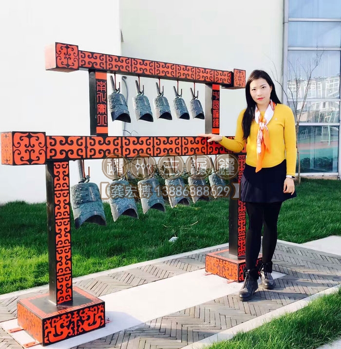 古編鐘公司銷(xiāo)售總經(jīng)理謝女士在編鐘前留影紀(jì)念。